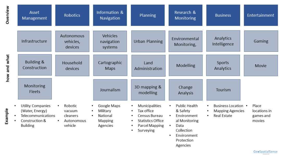 In a report from the UK where they analyzed a variety of job descriptions over a 5 year period, six main industries emerged. These included GIS specialists, Programmer & Data Management, Robotics & SLAM, Civil Engineers, Surveyors and Other.