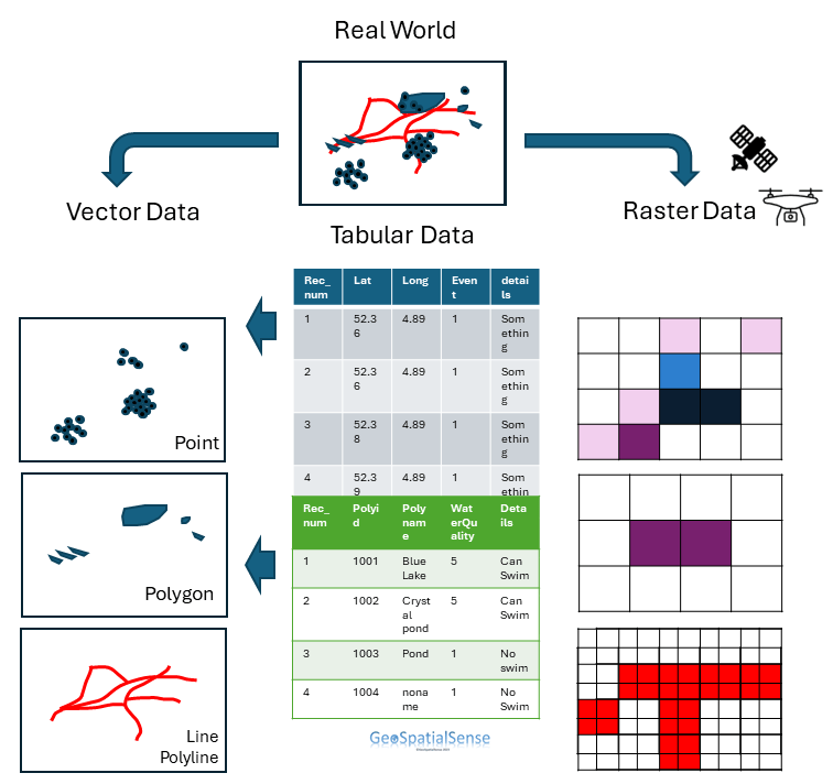 Geographic information can come in a variety of formats that can be vector, raster, tabular or as text.