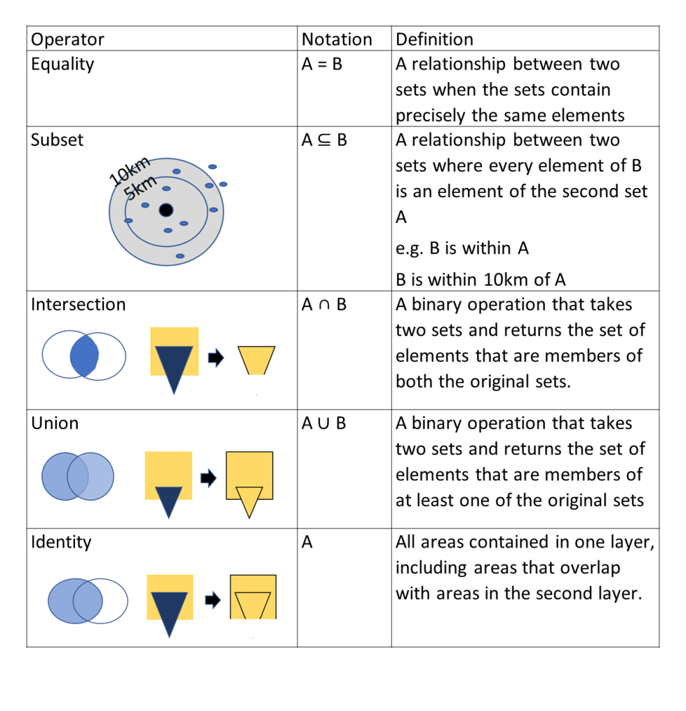 Many of these operations are available in GIS software packages where you can explore topological relationships between features based on their location but also based on their attributes.