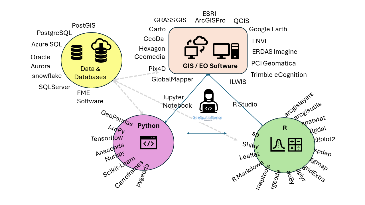With more than 30 software packages to choose from to perform a range of analyses, where does one start? What software or data platforms, programming languages and libraries? To get you started see the image below where I have provided an overview of GIS and EO (Earth Observation) software tools, libraries in R and Python and … Continue reading the geospatial ecosystem: Software, Libraries and Data Platforms