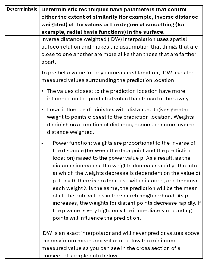 | Deterministic | Deterministic techniques use parameters that control either the extent of similarity of the values or the degree of smoothing in the surface. There are a number of different interpolators that include: Global polynomial, Local polynomial, Inverse distance weighted (IDW), Radial basis functions, Spline, Natural Neighbour |