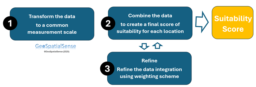 Suitability mapping methods (also known as overlay or multi-criteria decision analysis MCDA) are useful for combining and integrating different criteria, sometimes with different ranges of information. How the information is combined or integrated to create a single score can be based on expert knowledge.