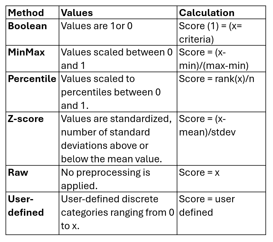 | 1. Transform data | Transform data for each criteria to a common measurement scale | Boolean MinMax Percentile Z-score Raw User-defined |
