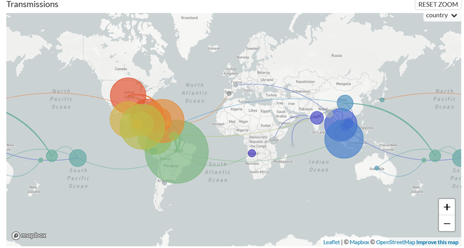 Screenshot of completed animation of the spatial and temporal distribution of the Zika virus based on geophylogenetic mapping 2004-2024.