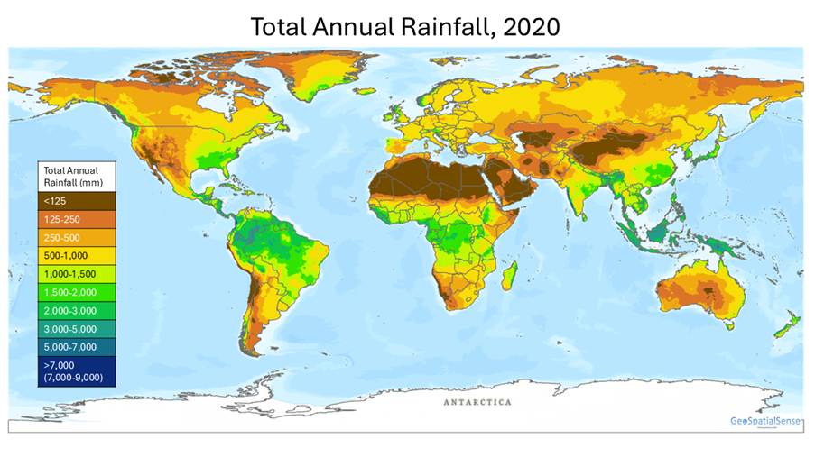 For the total annual rainfall map we added all of the rainfall for each month from January 2020 to December 2020. For the average annual rainfall we then divided the total annual rainfall by the number of months (N=12) to create average rainfall around the world. The two maps capture where rainfall is high and where it is low. The average rainfall map further accentuates the low rainfall areas.