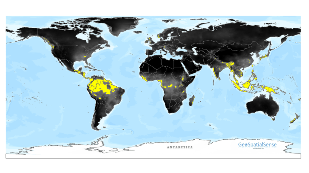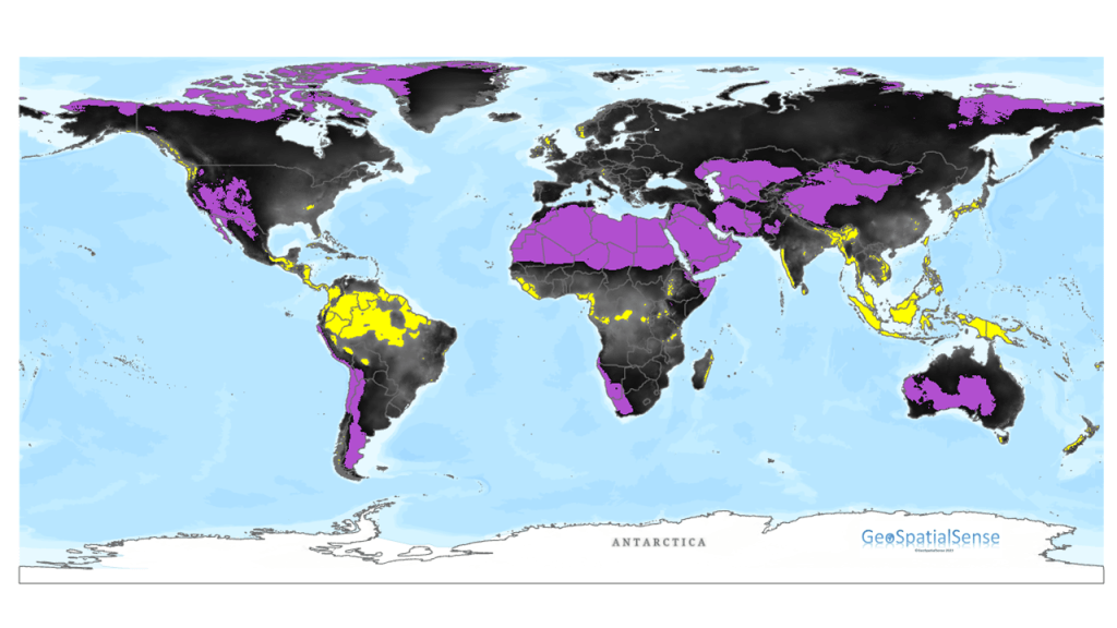 Note that the map was created using rainfall data for 2020 and as such the spatial distribution of rain forests will change from year to year with changes in total rainfall. More work is needed to examine stable rain forest locations but that is for another time.