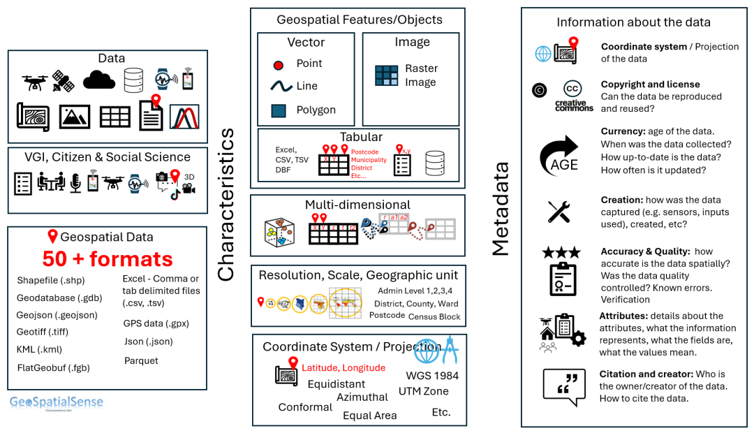 To help capture these complexities I have tried to provide an overview of the different elements associated with spatial data that include the many characteristics and information (metadata) about the data: